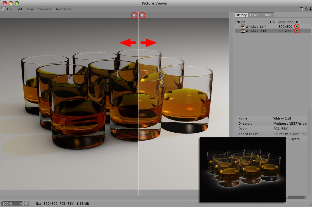 Vous pouvez comparer deux images directement dans le Visualiseur. Ce mode de comparaison peut être activé ou désactivé via l’option Comparaison AB. Les images à comparer sont à sélectionner dans la liste du panneau Historique et à différencier à l’aide des deux options suivantes.