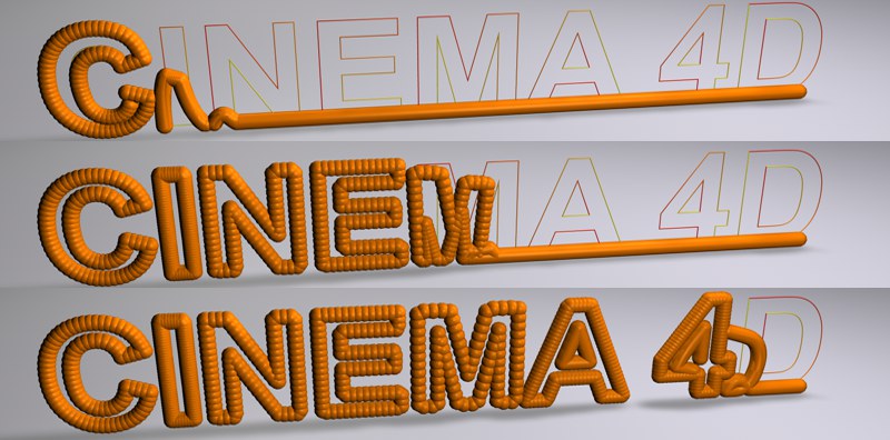 Que venons-nous de faire ? Les paramètres d’Atténuation peuvent être utilisés pour limiter l’effet de l’Effecteur. Le paramètre Champ Linéaire fait fonctionner l’effet du Champ sur l’axe Z positif. Il ne produit aucun effet sur l’axe Z négatif. L’effet de l’Effecteur va fonctionner de façon fluide sur les plans d’aperçu. Si le Champ est déplacé ou animé sur la longueur des clones, les clones seront disposés en conséquence sur la Spline Texte.