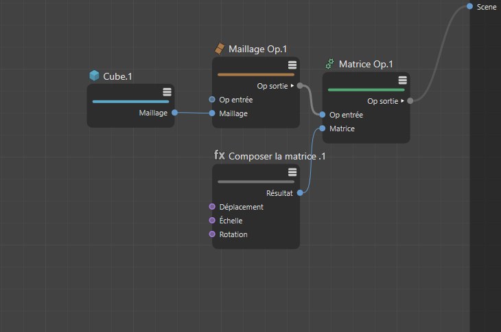 Un nœud Primitive est utilisé pour générer un cube. Cette sortie du nœud peut être connectée directement avec la racine de Scène, mais nous allons ajouter d'abord notre propre matrice, afin de pouvoir contrôler la position, l'échelle et la rotation de notre cube comme nous le voulons . La sortie du nœud Op matrice contient des informations relatives à la position du cube et peut être envoyée à la scène. Le cube apparaitra alors à la position définie avec la rotation respective dans la vue. Alternativement, nous pourrions utiliser le noeud "Primitive" lui même qui possède une matrice pour le déplacement, la rotation et la mise à l'échelle.