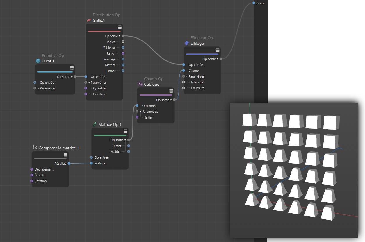 Bien sûr, la position et la forme des copies créées peuvent être modifiées. Divers effecteurs sont disponibles grâce auxquels vous pouvez effectuer cela. Le nœud Op effecteur offre une vaste gamme de déformations communes telles que la dilatation/contraction, l’effilage, la torsion et la courbure. Vous pouvez aussi créer des algorithmes personnalisés via un nœud groupe effecteur. Les champs séparés, qui peuvent être sélectionnés via un nœud Op champ, peuvent être utilisés pour restreindre spatialement l’effet de la déformation :