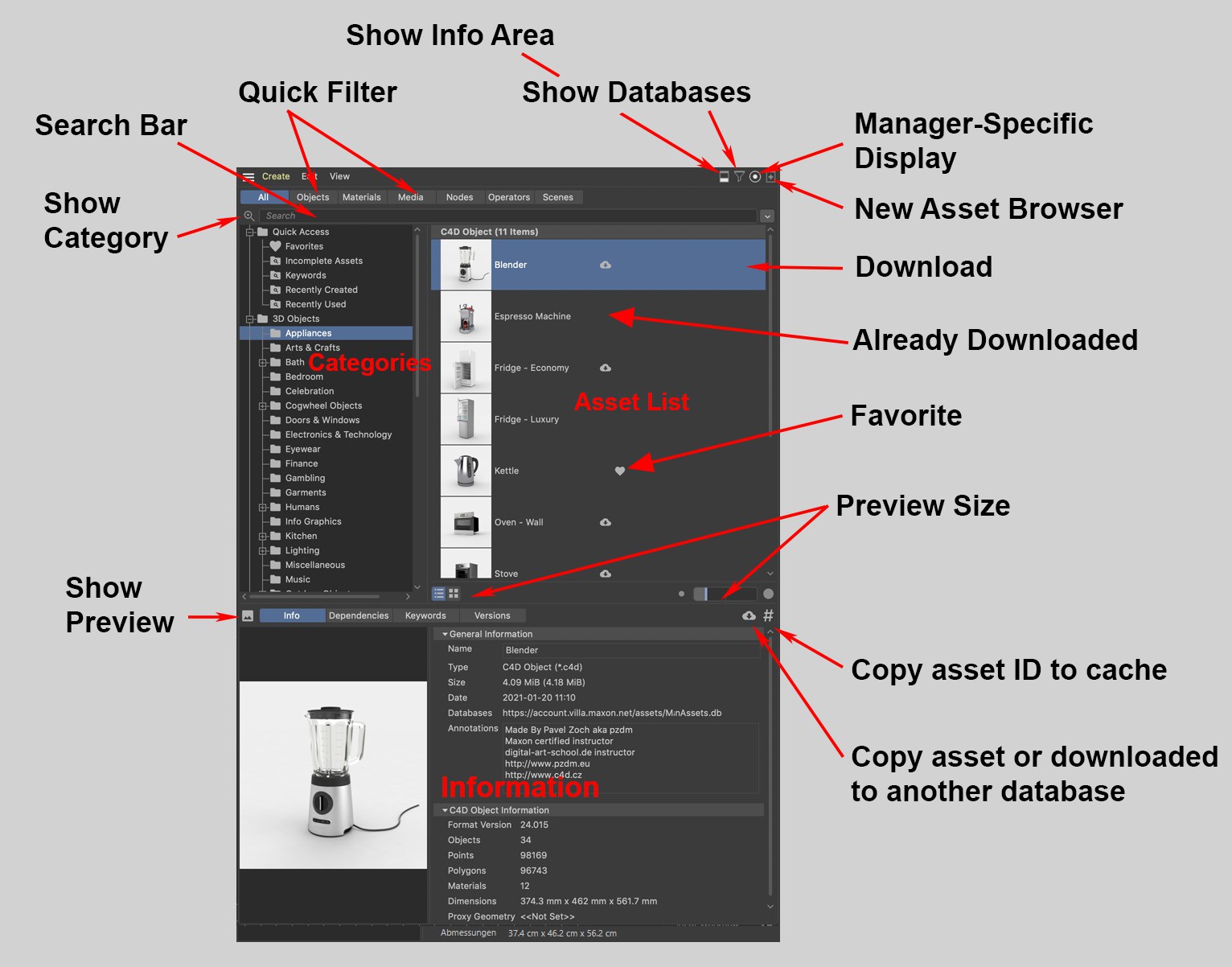 - La puissante base de données permet d'inclure des métadonnées, des images de prévisualisation, des mots-clés, des dépendances (par exemple, des JPEG qui sont affectés à un matériau) et d'autres éléments dans une ressource, ce qui facilite grandement le travail avec les ressources (par exemple, leur localisation dans une énorme base de données).