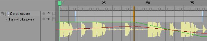Le rendu audio de CINEMA 4D permet d'utiliser des clés pour ajuster le volume et la balance des pistes audio (de la même manière que la plupart des applications de montage vidéo). En mode Feuille d’exposition, les courbes de la piste audio affichent la progression du volume et de la balance du fichier audio.