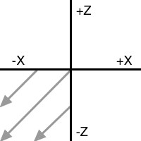 Lorsque le vent souffle sur deux ou trois axes au même moment, un vecteur sera calculé entre les directions. Avec la direction donnée de –1 m / 0 m / -1 m, un vecteur sera créé à un angle de 45 degrés dans le quadrant XZ négatif (voir l’image de gauche ci-dessous).