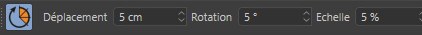 Utilisez ce réglage pour définir les intervalles de déplacement pour un élément donné. Ce paramètre, ainsi que les deux suivants, permettent de définir le degré de déplacement, de mise à l’échelle et de rotation, respectivement, lorsqu’un curseur de déplacement est activé.