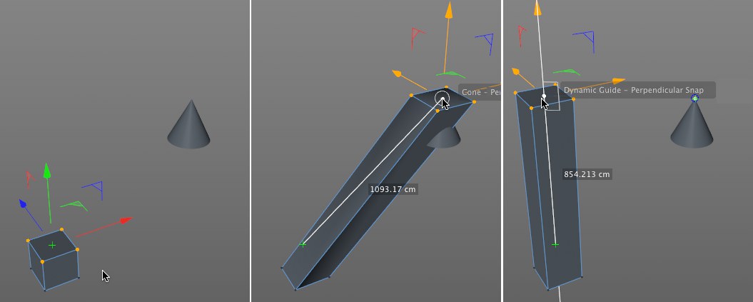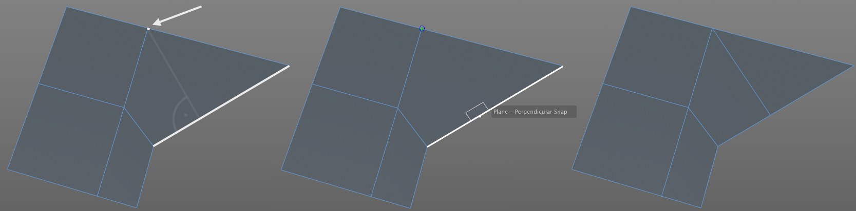 Utilisez "Magnétisme perpendiculaire” pour magnétiser les lignes perpendiculaires à une ligne (guides ou arêtes d’un polygone). C’est l’un des réglages Magnétisme les plus importants. Cette option est un tout petit peu plus difficile à comprendre mais elle peut être très utile. Si vous savez l’utiliser correctement, vous pouvez même travailler sans la vue orthographique pendant la modélisation. Regardez un peu les quelques exemples ci-dessous, ils vous éclaireront un peu plus sur le sujet.