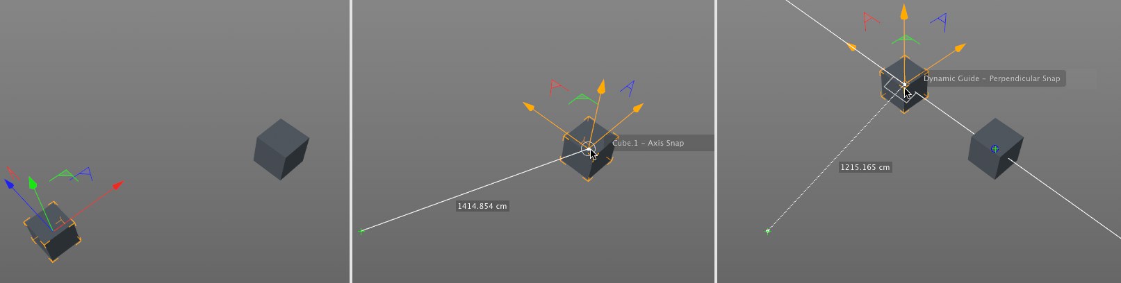 - Faites glisser le cube sélectionné au-dessus du centre du cube droit en appuyant sur le bouton de la souris et tenez-le pendant une demi seconde au moins (Magnétisme de l’axe sera ensuite affiché) pour créer un point guide.
