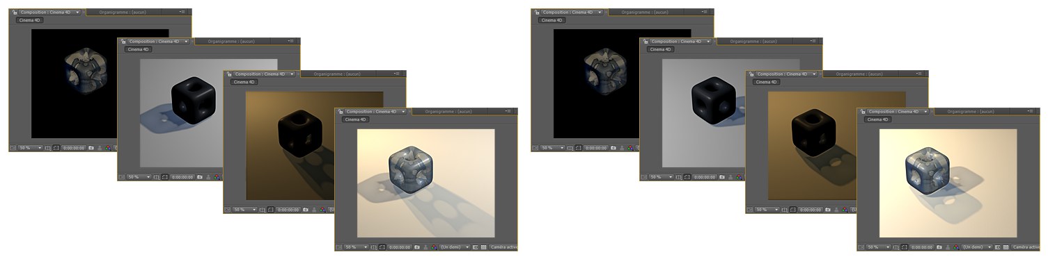 Supposons l’exemple suivant : vous avez rendu un film complexe et vous constatez que les réflexions sont trop intenses. Si vous avez effectué un rendu multi-passes, il est inutile d’effectuer un nouveau rendu de la scène dans Cinema 4D ; Il suffit de réduire l’opacité du calque de réflexions dans votre logiciel de compositing. Vous pouvez également inclure différents systèmes d’éclairage au même rendu et choisir le système le plus approprié ultérieurement.