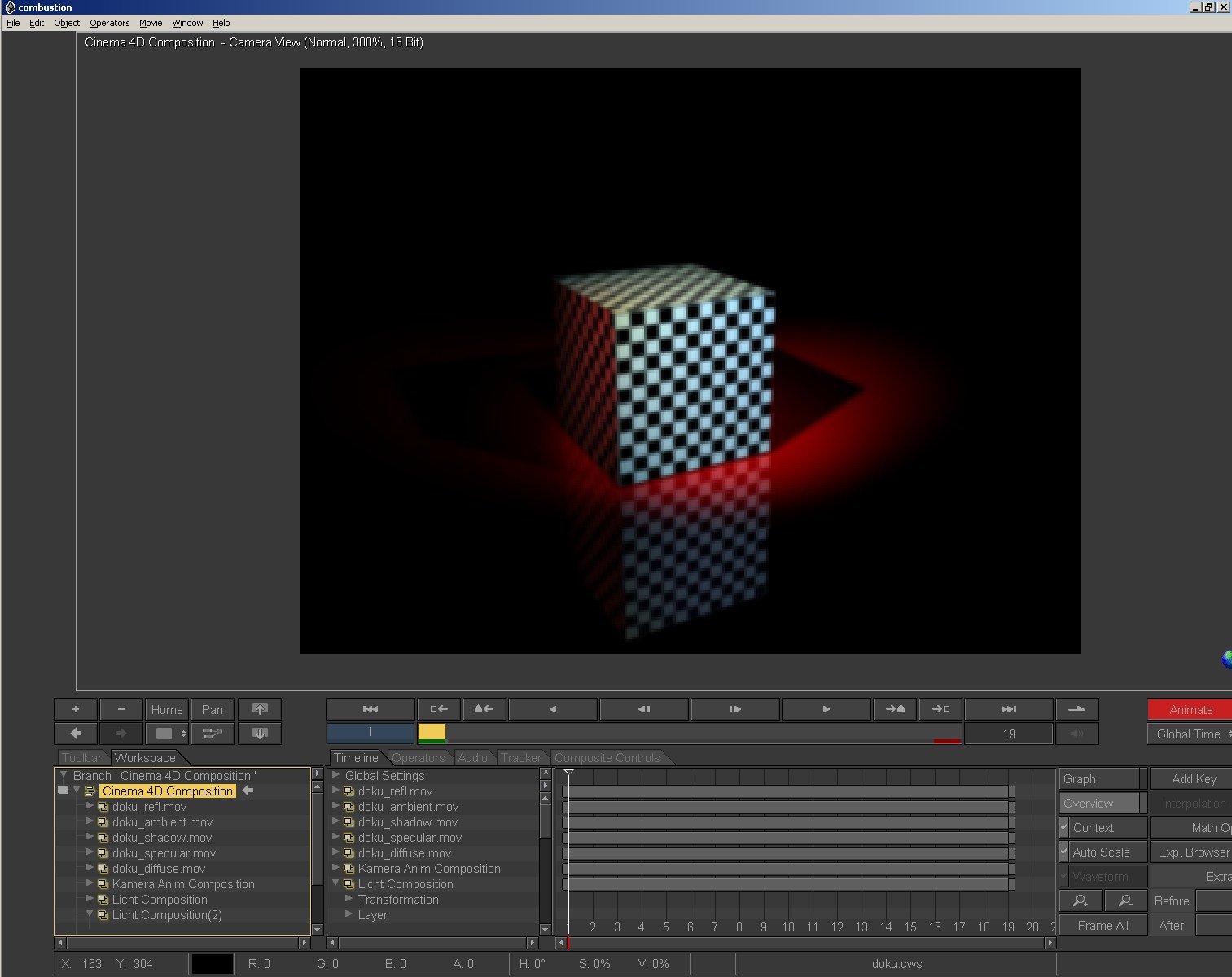 - Adobe After Effects (CS3 ou ultérieure) : Fichiers multi-passes, données de caméra, lumières et objets neutres (voir aussi After Effects en ce qui concerne les diverses possibilités d’échange).