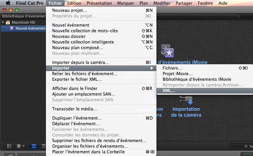 Dans Final Cut Pro, importez le fichier .xml (Fichier / Importation / XML) sans tenir compte de l’alerte affichée.