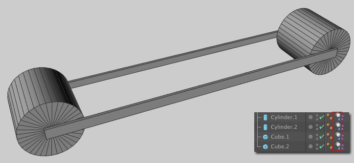 La plupart du temps, une charnière peut être placée le long de l'axe de rotation. Regardez la scène d'exemple qui contient 2 cylindres et 2 cubes, chacun comportant une propriété dynamique de corps: