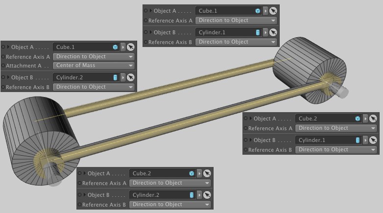 Sans connecteur, ces éléments s'effondreraient tout simplement sans interagir entre eux (à part des collisions fortuites). Afin de construire un engin, vous aurez besoin de quatre connecteurs Charnière qui relient les deux cubes aux axes de rotation. Créez 4 Connecteurs Charnière. Deux seront liés à l'axe de rotation du premier cylindre et deux seront liés à l'axe de rotation du deuxième cylindre (la fonction Transfert est très utile ici). L'endroit où se trouvent les connecteurs sur l'axe de rotation n'a pas d'importance - ils peuvent être déplacés par rapport à l'axe sans affecter la fonctionnalité. A des fins d'organisation, toutefois, c'est mieux de les positionner à l'endroit voulu. Dans cet exemple, ce serait à l'endroit où les cubes sont reliés au cylindre. Ensuite, vous devez lier les cylindres et les cubes (bien sûr aux points de rotation souhaités) dans les réglages de rotation (onglet Objet):