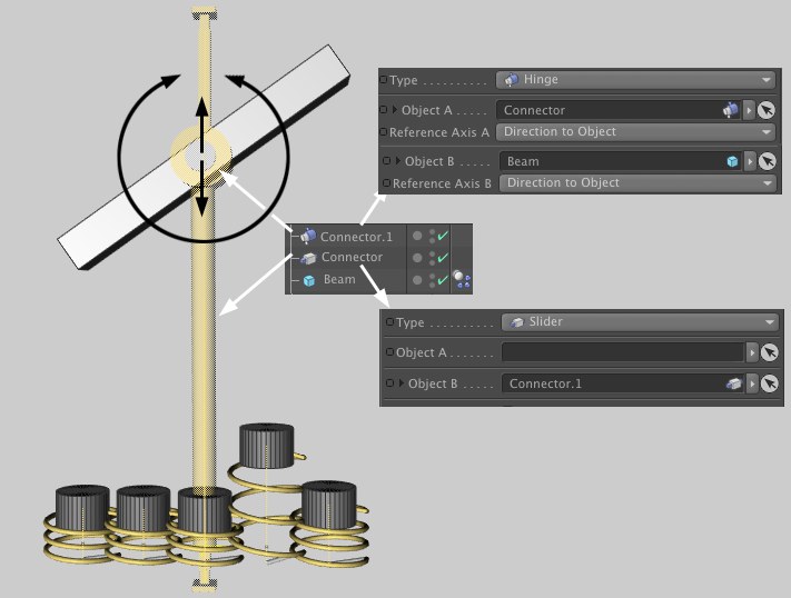 - Dans les réglages du paramètre Connecteur (onglet Objet), utilisez les champs de l'Objet A et de l' Objet B pour lier les objets aux propriétés Corps.