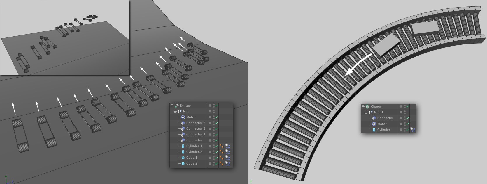 A gauche de l'image ci-dessus, un véhicule a été équipé d'un Moteur et la construction entière a été transformée en sous-objet d'un Emetteur. L'Emetteur règles les véhicules sur libre pour qu'ils puissent circuler indépendamment. A droite se trouve un simple cylindre, aussi propulsé par un Moteur et cloné en une forme courbe à l'aide d'un objet Clone. Cela donne un transporteur en marche.