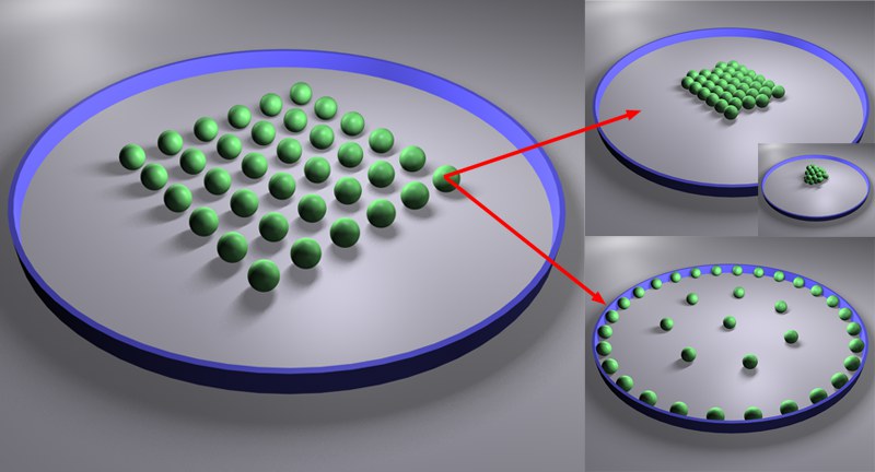 L’Objet Force Dynamique affecte le groupe de Clones représenté sur la gauche. Sur la droite, il est défini respectivement comme une force d’attraction et de répulsion (peut être défini comme Intensité positive ou négative).