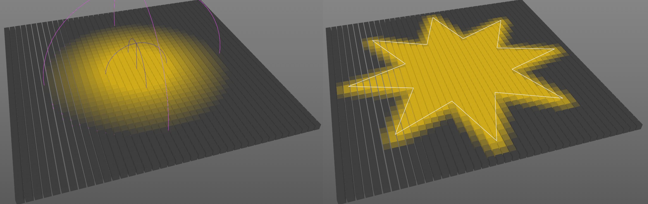 L’effet de la couleur dans un Champ sphérique (gauche) et un calque objet spline (droite). Le Champ sphérique a été placé dans un Effecteur simple.