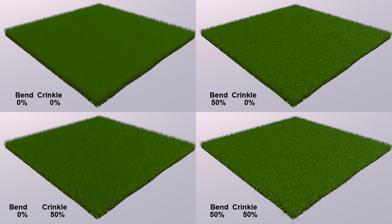 Le paramètre Plier fait se plier les brins de gazon. Plus haute est la valeur, plus les brins se plieront de manière aléatoire dans une seule (!) direction (cela forme un contraste avec le paramètre Plisser qui plissent les brins dans plusieurs directions).