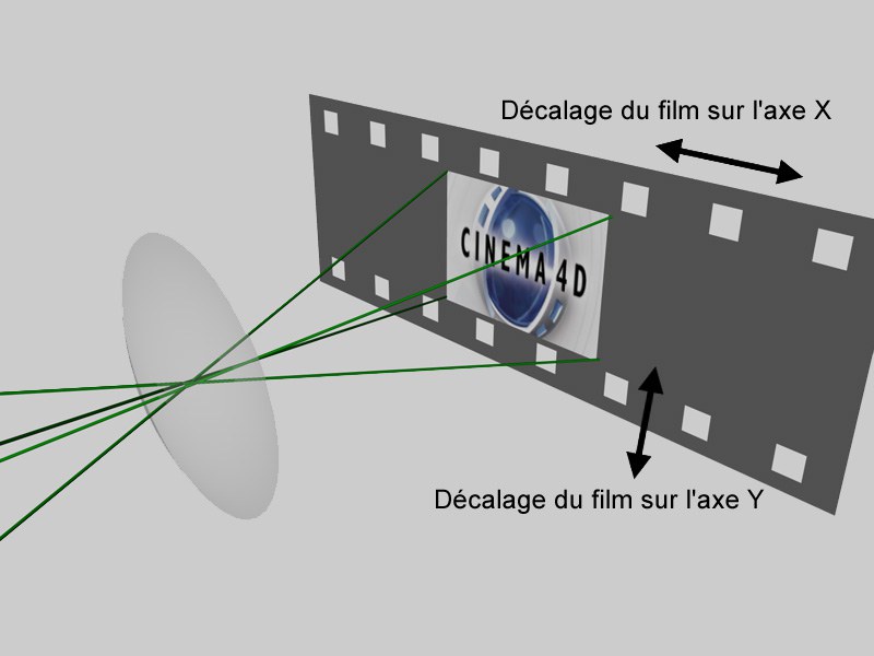 Supposons qu’une caméra Cinema 4D fonctionne comme une caméra traditionnelle, les images étant enregistrées successivement sur pellicule. Maintenant, imaginez qu’il soit possible de déplacer le film obtenu sur les axes X et Y (c’est-à-dire au-delà des limites de la pellicule). C’est exactement le rôle de ces paramètres. Cinema 4D pousse le concept un peu plus loin en ce sens que l’utilisateur ne sera pas limité à la taille de la pellicule.