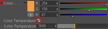 La balance des blancs peut bien sûr être utilisée pour colorer les rendus. La valeur neutre s'intitule Lumière du Jour (6500K). En règle générale, des valeurs plus basses donnent des teintes bleues et des valeurs plus élevées, des teintes jaunes (complètement à l'opposé de la représentation ci-dessus, la balance des blancs est au final une valeur de correction).