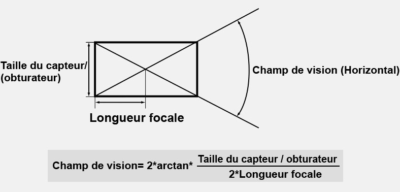 La Longueur Focale est directement reliée à l'« angle de champ » dans la formule illustrée ci-dessous.