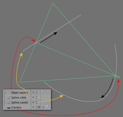 Une variante flexible de la seconde méthode met en jeu deux splines et une caméra de visée pointant sur un objet neutre. Une spline est utilisée comme trajectoire de caméra et l’autre comme trajectoire de l’objet neutre (vous aurez besoin de deux propriétés Aligner sur la spline : une pour la caméra et une pour l’objet neutre). Naturellement, l’objet neutre doit rester en place lorsque la caméra doit pointer pendant un certain temps sur la même position.