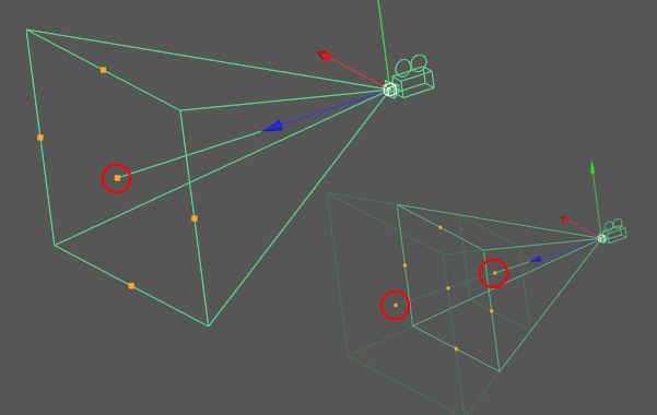 A gauche, la Distance Focale (plan focal) est entourée, à droite les points délimitant le plan de profondeur de champ sont entourés (quand sélectionnée et que la Caméra Physique n'est pas utilisée).