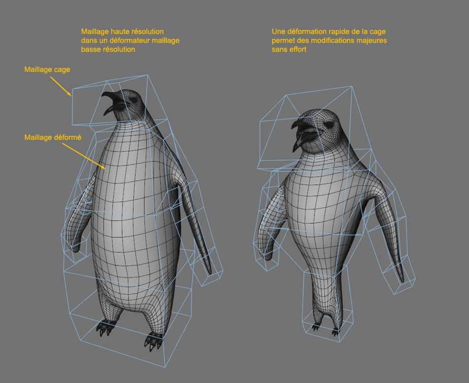 Par exemple, il pourrait replacer un long paramètre de peinture d'une articulation/influence si vous avez besoin de faire des rapides déformations. Il peut aussi être utilisé conjointement aux Articulations, bien sûr, car ce maillage à basse résolution peut être utilisé pour faire fonctionner un qui ait une résolution beaucoup plus forte, ce qui serait problématique pour influencer correctement les Articulations. Au lieu de cela, vous pouvez influencer vos Articulations directement sur cette cage à basse résolution qui à son tour déformera le maillage à haute résolution.