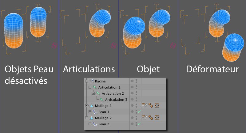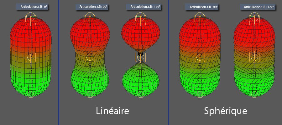 Déforme le maillage comme l'ancien système d'os. La méthode Linéaire est la plus rapide, mais dans certains cas, elle peut provoquer le rétrécissement de la géométrie dans la direction de l'axe d'articulation, lorsque les articulations tournent selon des angles très larges.