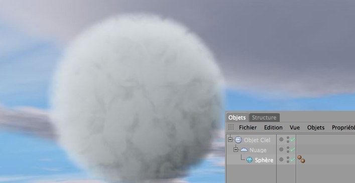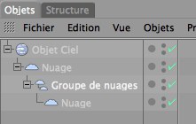 Pour créer un nuage manuellement et sans volume initial (Nuage), faites de l’objet Nuage un sous-objet de l’objet Ciel.