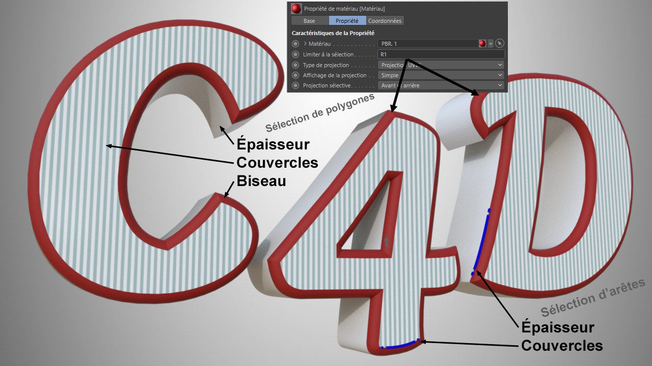 - Vous pouvez soit activer l'option correspondante dans le menu Sélections de polygones, ce qui créera une propriété de sélection de polygones. Cette propriété peut alors, par exemple, être placée dans le champ Limiter à la sélection de la propriété Texture.