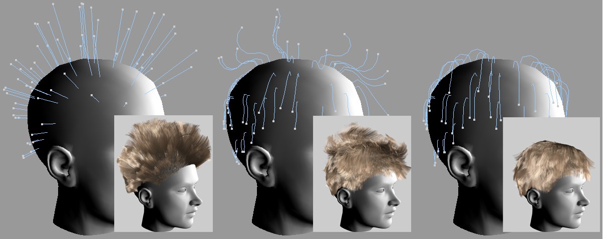 - Pour créer un style de coiffure. Les guides (et donc les cheveux) sont généralement projetés perpendiculairement à la surface sur laquelle ils ont été plantés, ce qui n’est pas réaliste. Il suffit d’ajouter des dynamiques et les cheveux vont tomber pour reposer naturellement sur la tête. Le sommet de la tête peut également faire office de surface de collision, ce qui empêche les cheveux ou les guides de traverser la surface. Cet état peut être enregistré et utilisé comme point de départ pour d’autres étapes de stylisation.
