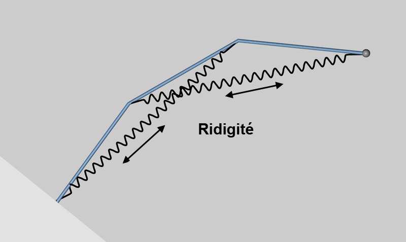 - Les ressorts compris entre chaque point de masse (qui ne peuvent pas varier). La masse des guides est concentrée dans les points de masse, dont l’effet est visible dans les différents mouvements des ressorts.