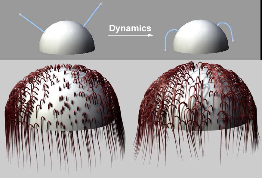 - Pour faire en sorte que les cheveux aient un mouvement naturel basé sur la gravité et d’autres forces, mais aussi sur le mouvement de la surface sur laquelle ils poussent. Pour l’animation de personnage : supposons que votre personnage ait envie de faire un petit jogging. Ses cheveux doivent accompagner son mouvement. Il suffit d’ajuster quelque réglages et tout le reste sera automatique!
