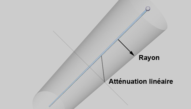 Utilisez ce paramètre pour définir l’intensité de la force émise radialement autour du guide. L’intensité va s’atténuer comme définie par le paramètre d’atténuation et ne produira aucun effet en dehors du rayon défini. Les valeurs positives repoussent et les valeurs négatives attirent.