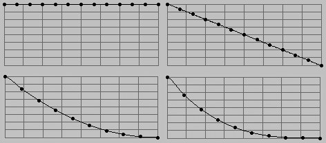 Utilisez ces graphes de fonction pour définir l’atténuation entre le guide et le rayon de l’effet défini par le paramètre Rayon. Utilisez l’option Définir pour définir une atténuation personnalisée.