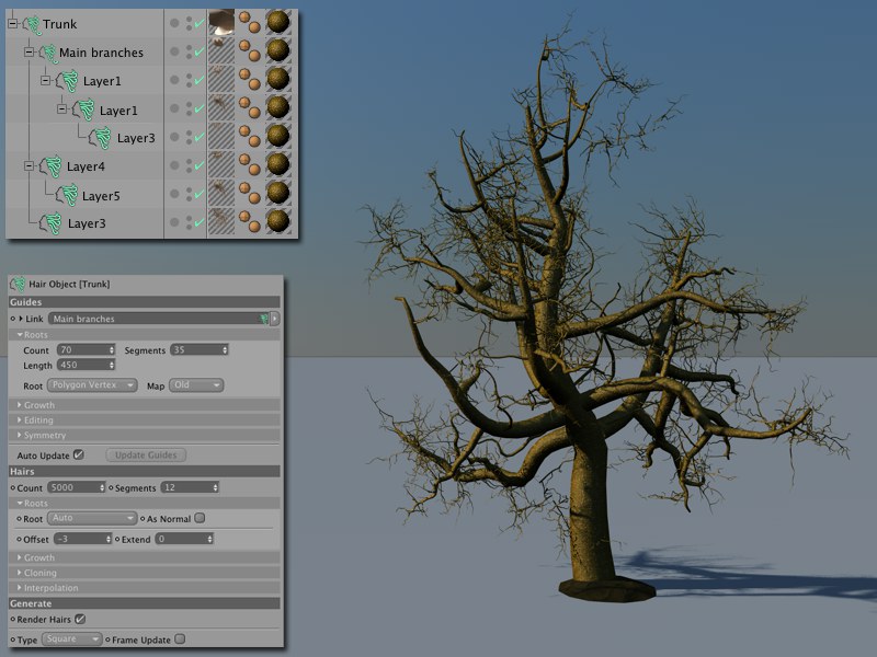 Les branches de l’arbre que vous voyez sur l’image ci-dessus correspondent chacune à un objet Cheveux avec un nombre de Guides et de Cheveux croissant. Pour créer les plus petites branches on a utilisé le canal Crêper.