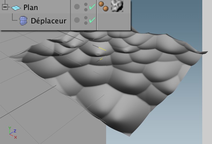 A gauche : résultat dans la vue; à droite : résultat au rendu. La subdivision du plan est relativement élevée.