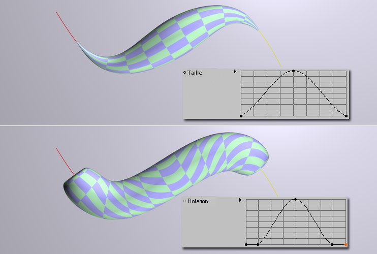 Utilisez ces graphes de fonction pour définir la proportion de taille sur la longueur de l’objet déformé. La mise à l’échelle se produit sur un plan vertical par rapport à la tangente de la spline. L’axe X du graphe reflète la longueur de l’objet déformé : si l’objet est déplacé sur la spline via l’option Décalage, sa mise à l’échelle va demeurer constante (contrairement au graphe Taille de spline).