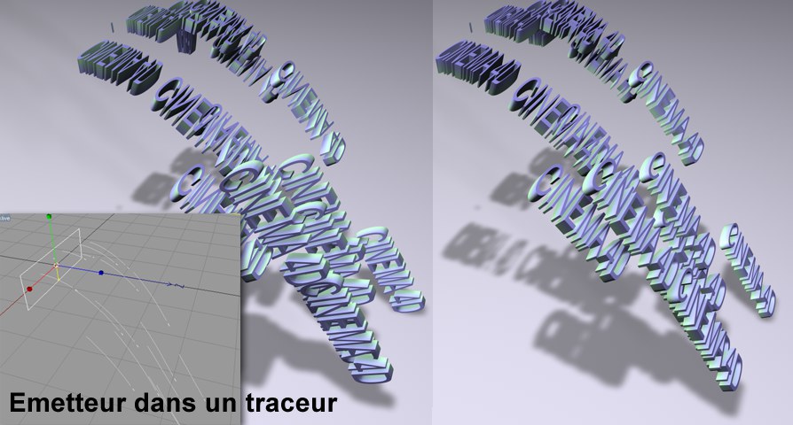 Nous avons utilisé une Enveloppe spline pour déformer un objet Texte. Les splines ont été générées à l’aide d’un objet Traceur. Le texte de gauche a l’air moins dynamique que le texte de droite, auquel a été appliqué un Vecteur de correction.