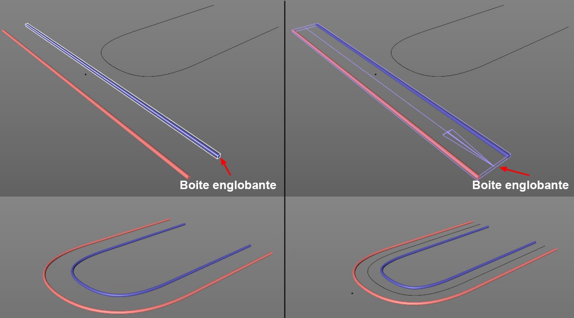Ces paramètres peuvent être utilisés pour adapter précisément la position et la taille de la boîte de sélection. Rappel : la longueur de l’axe de la boîte de sélection (qui passe par le centre de cette dernière) définit les zones de l’objet à déformer qui seront placées sur les premier et dernier points de la spline.