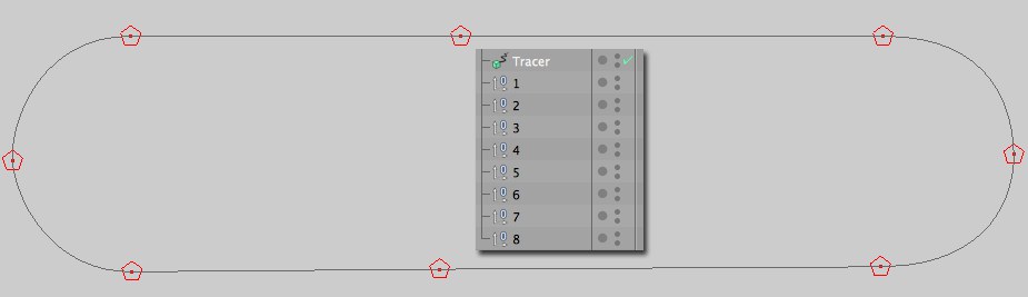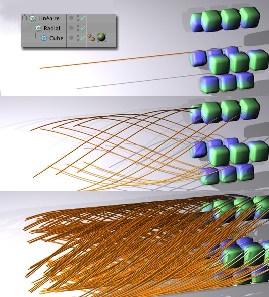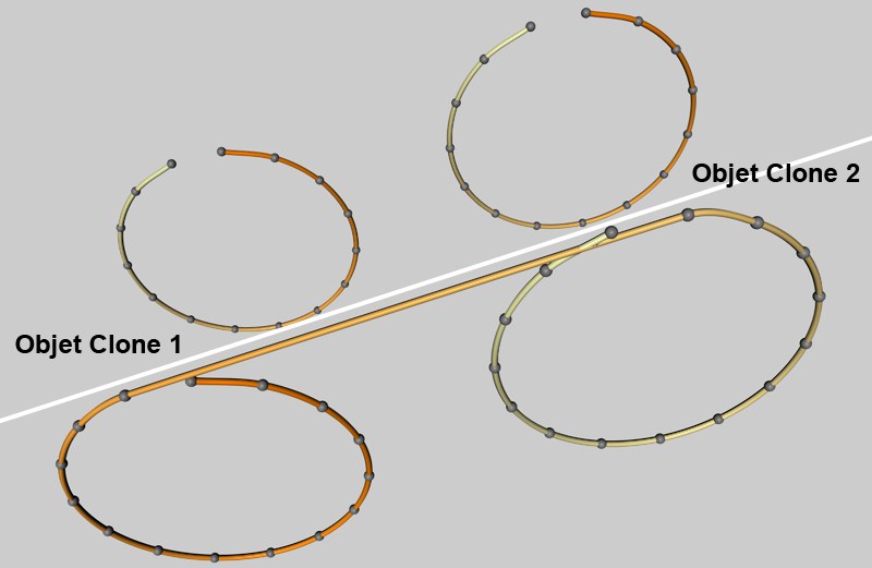 Les objets ou particules (les points d’objets peuvent également être connectés en fonction du type d’objet tracé ou des modes de gestion des cloneurs) de différents objets tracés par le même Traceur seront connectés par une spline commune, mais avec des segments différents.