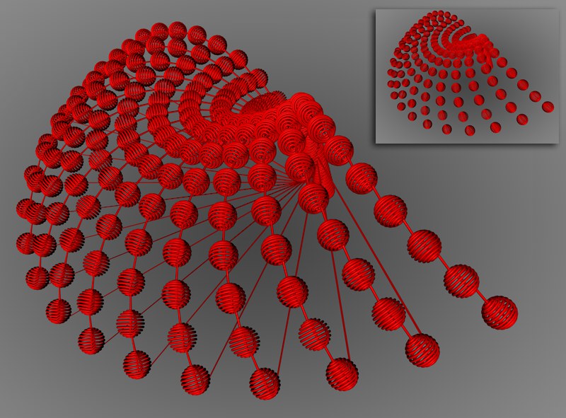 Une sphère clonée respectivement en mode Connecter tous les objets et en mode Connecter tous les éléments, (en haut à droite).