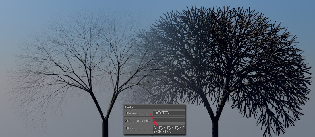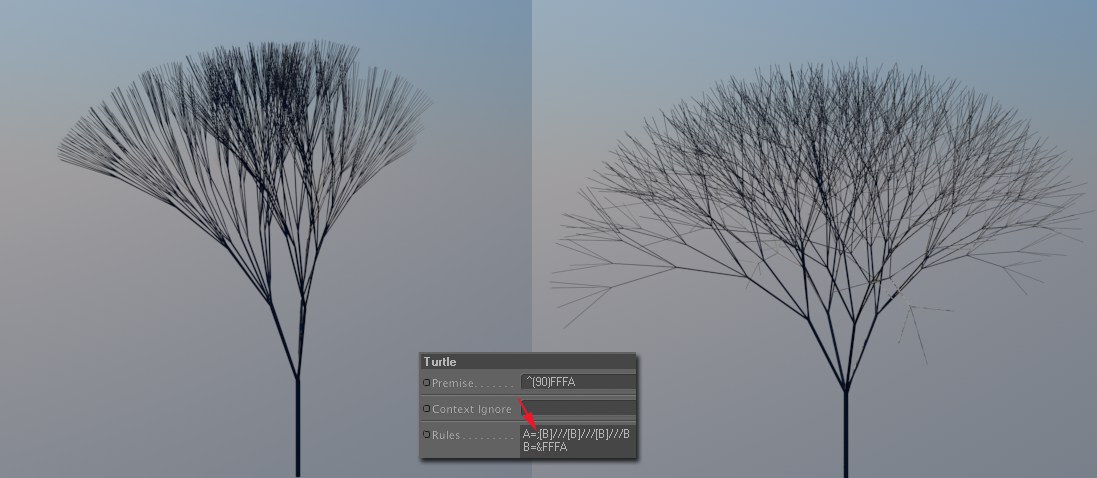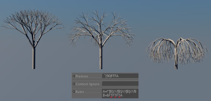 Si vous définissez un ou plusieurs "T" dans la chaîne de caractères (comme dans la règle par défaut "B=&FTFTFTA), chaque ligne suivante sera incurvée en direction de l'axe Y (c-à-d, vers le bas). S'agissant du L-System en forme d'arbre, cela signifierait que les branches de l'arbre tomberaient vers le bas (comme on le voit fréquemment concernant les arbres tropicaux, en dépit du nom donné à ce paramètre).