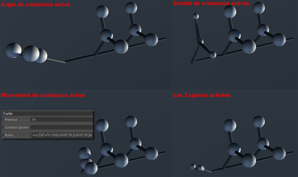 Grâce à ces trois options, vous pouvez définir l'aspect des "pousses" à chaque génération de croissance lorsque le paramètre Croissance est animé.