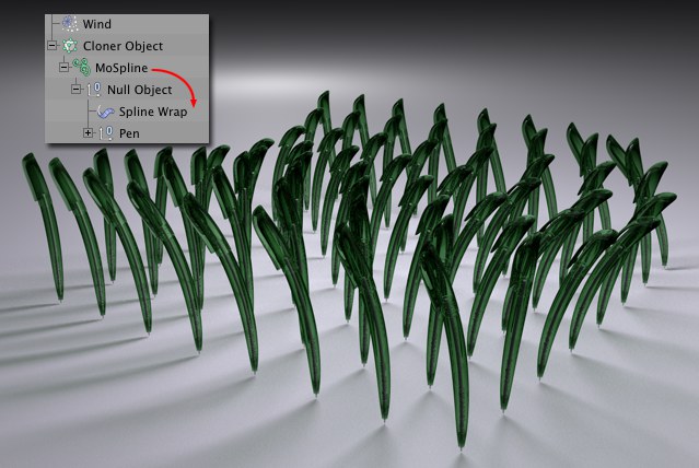 L’objet MoSpline peut être utilisé partout où il y a des Splines. Des objets peuvent être placés sur un objet MoSpline par le biais de l’objet Cloneur. Si l’objet Cloneur clone aussi à son tour des MoSplines, il est possible de créer la structure suivante en forme de plante :