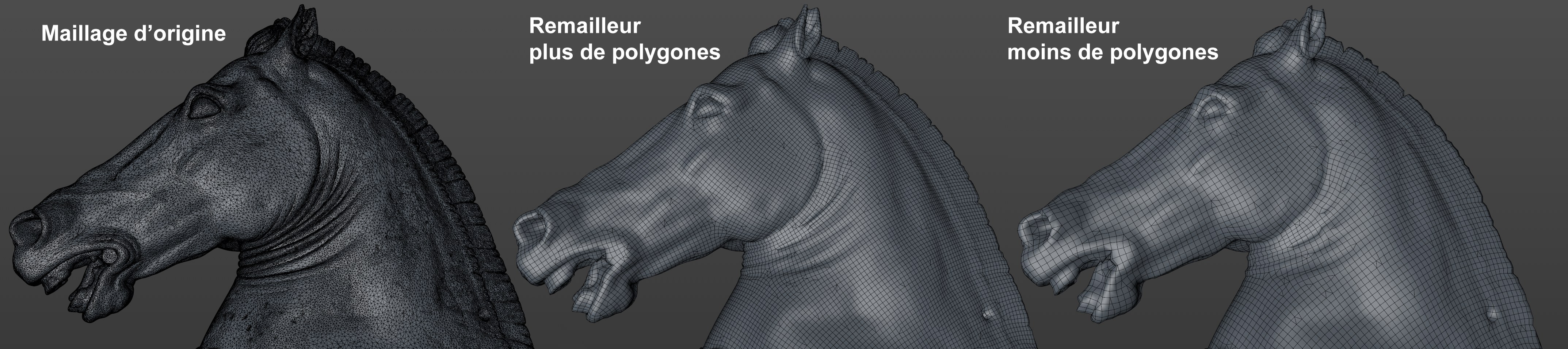 Le seul léger inconvénient est que cela ne fonctionne pas toujours aussi bien que dans l’image ci-dessus. Les modèles CAO notamment, ou les "modèles d’objet rigide” (modèles techniques) sont généralement moins bien adaptés à l’algorithme utilisé par cette fonction. Dans ces cas-là, des trous dans le maillage peuvent se produire et des arêtes dures risquent d’être remaillées de manière imprécise.
