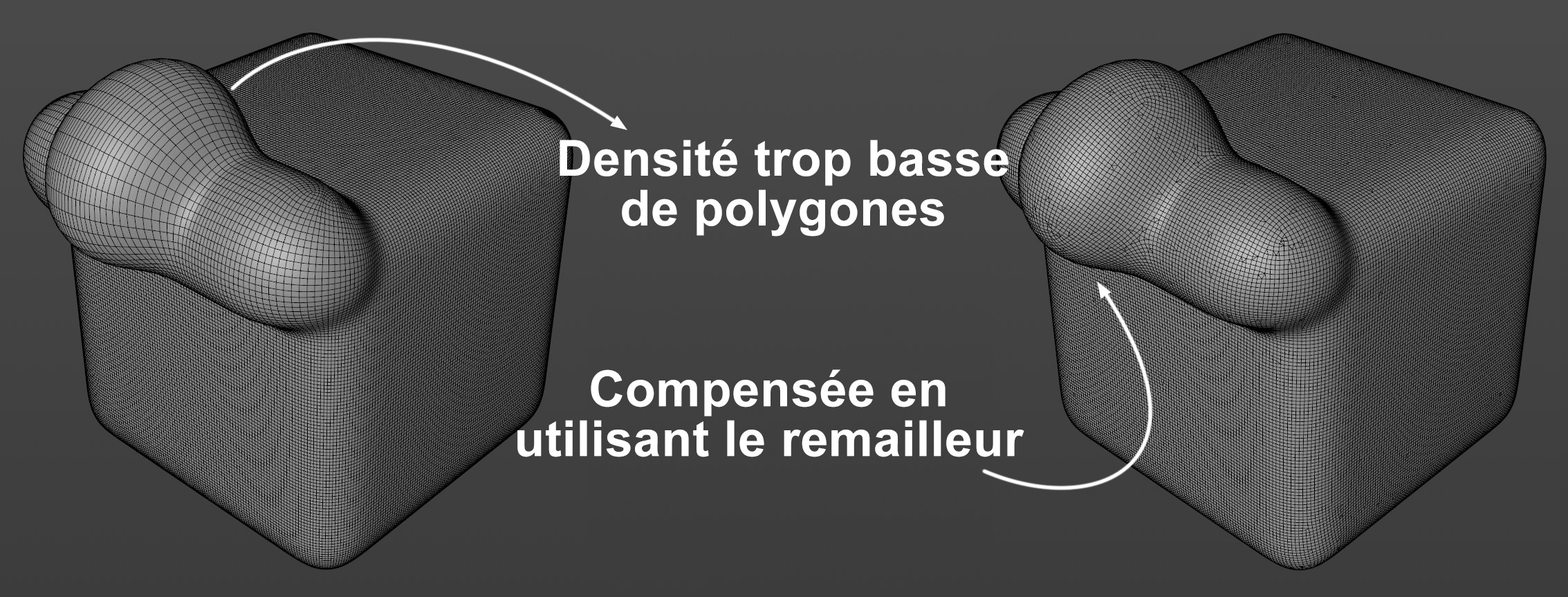 Exemple : La densité polygonale des maillages créée à l’aide de la fonction sculpture peut être "normalisée”.