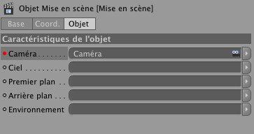 Pour assigner un objet à l’objet Mise en scène, déposez un objet Caméra, Ciel, Premier plan, Arrière plan ou Environnement dans le champ approprié du gestionnaire d’attributs.