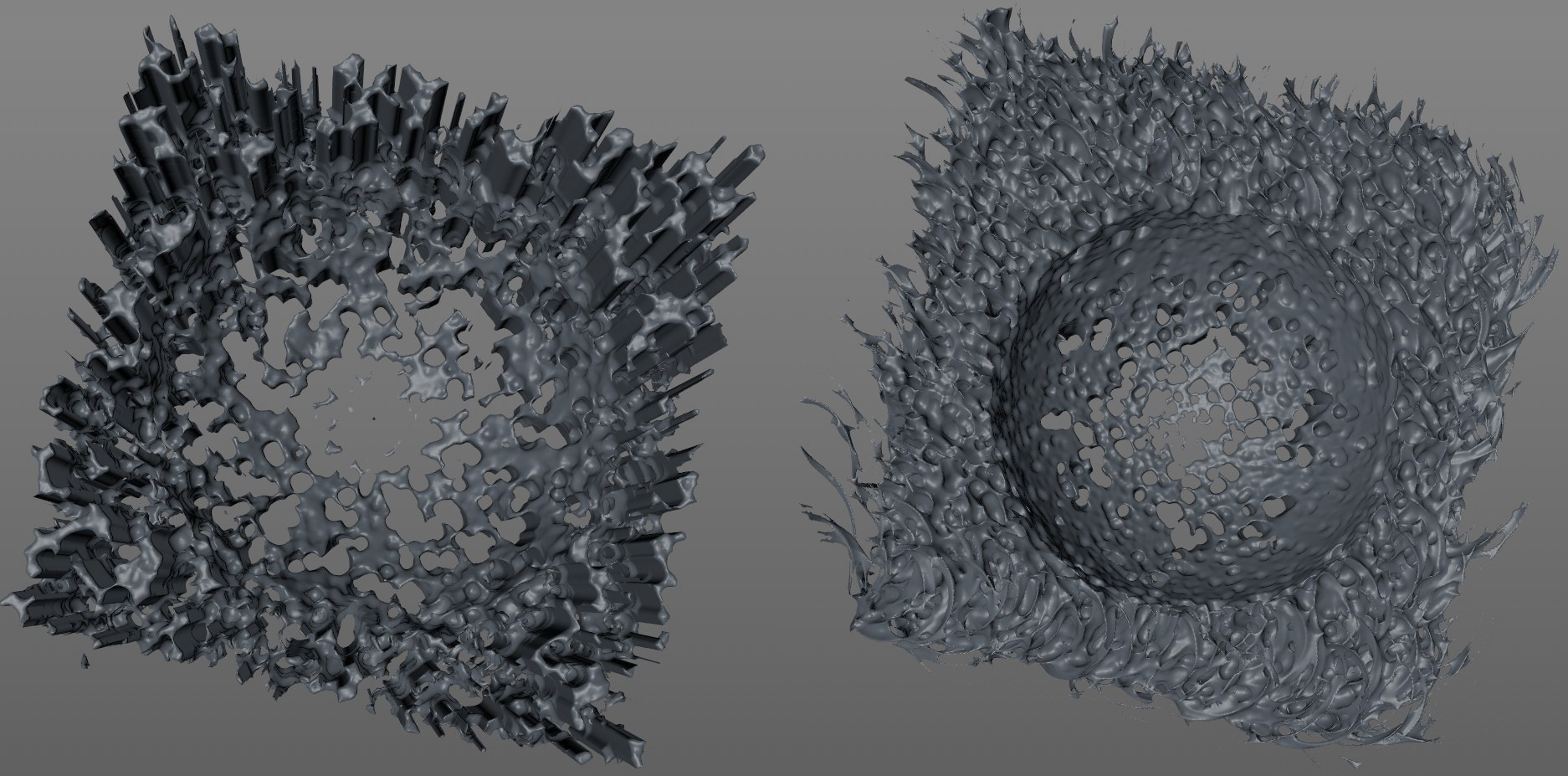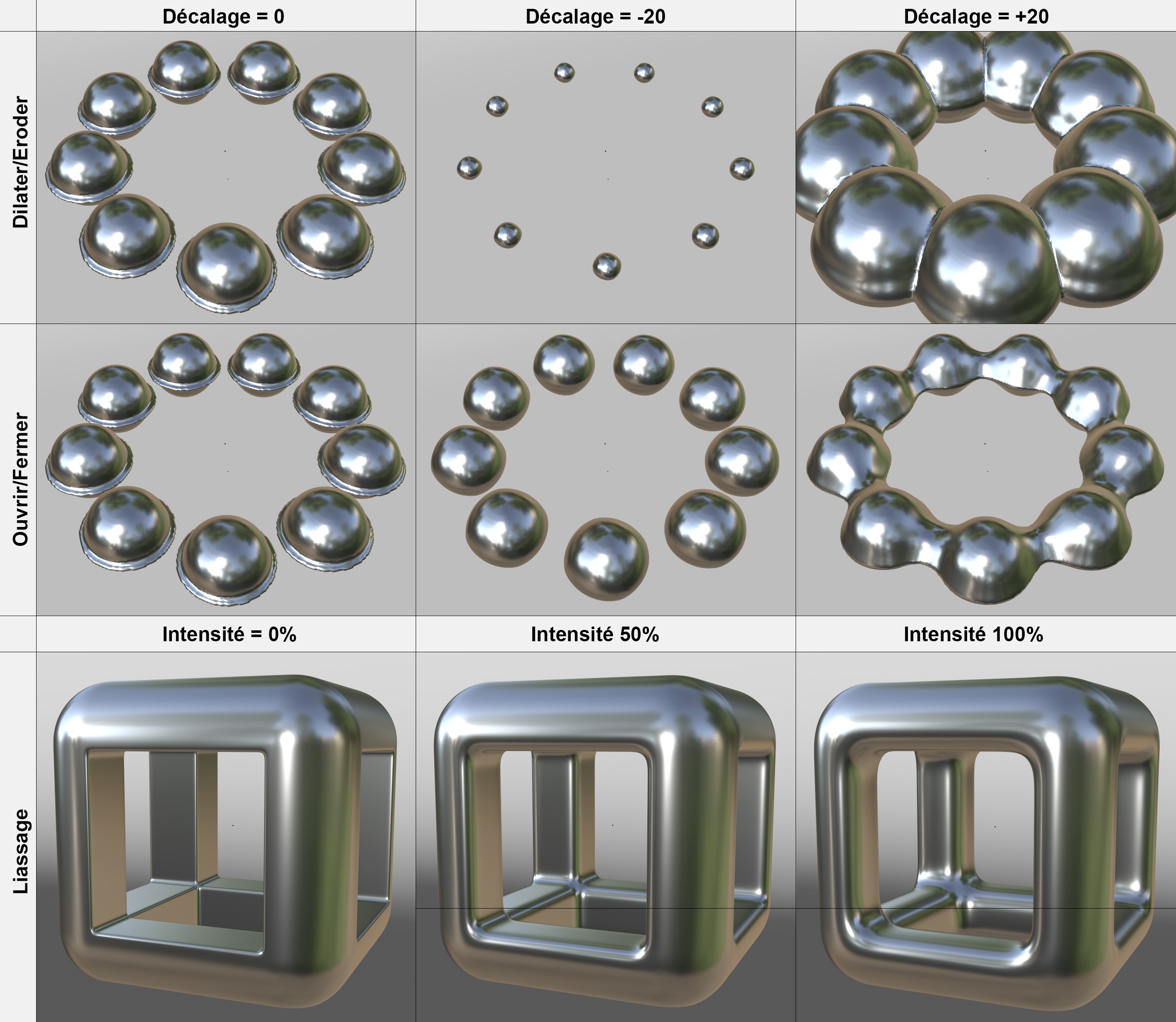 Notez la manière dont les deux Opérateurs lissent les détails (pics, trous) alors que ceux de droite conservent dans l’ensemble ces irrégularités (avec des temps de rendu plus longs) ; Type de Volume Champ de Distances Signées et Brouillard présentent nettement moins d’options.