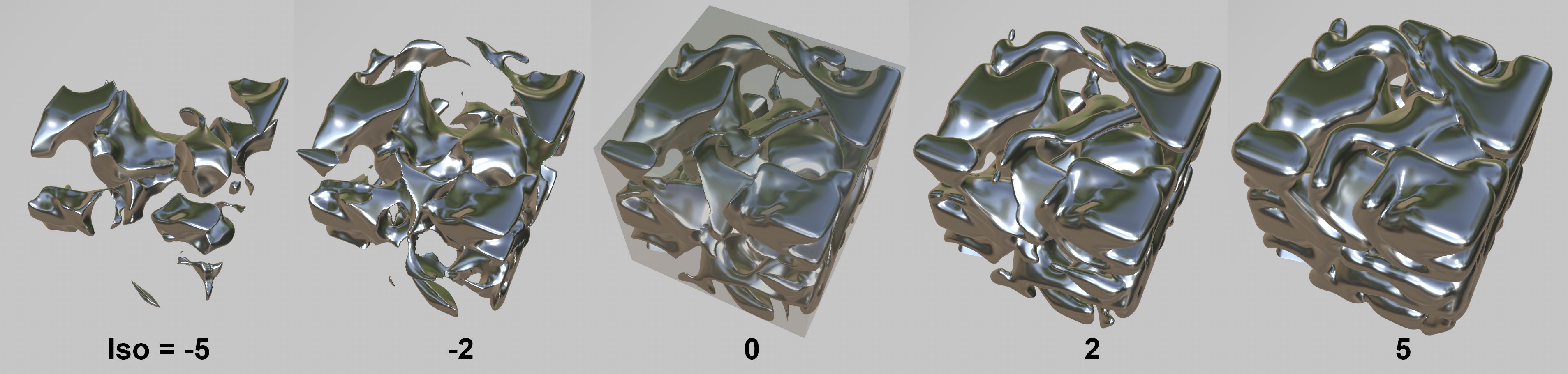 Ce paramètre peut être utilisé pour recouvrir la surface polygonale générée uniquement entre les calques de Voxel interne et externe existants (Champ de distance signée (CDS)) ou les valeurs de Voxel Minimum et Maximum (Brouillard). Contrairement à l’usage de valeurs ISO (voir ci-dessous), cela produira toujours un maillage.