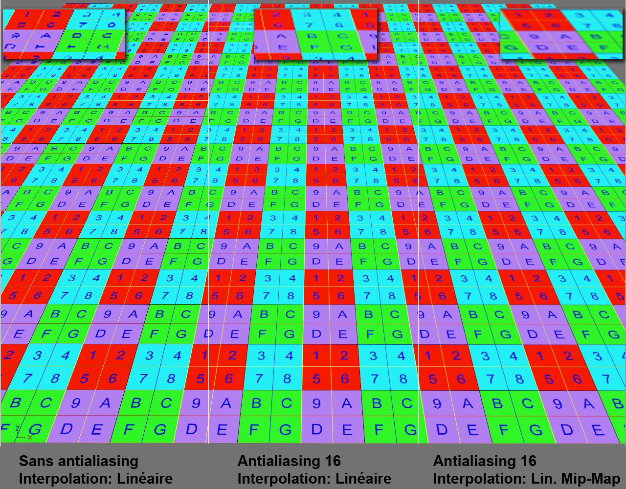L’Interpolation de texture réglée sur Au Plus Proche (en haut à droite) et sur Linéaire (en bas à droite).